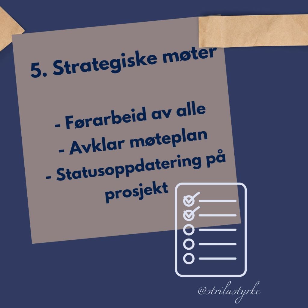 5. Har tydeleg strategi for møtene. Det kan vere at alle er forventa til å ha førebudd seg for at alle stiller likt og ein ikkje sløser tid. Ha status på prosess i alle prosjekt slik at alle er oppdatert. Tydeleg tidsplan og ha avklarte forventingar til møtet.