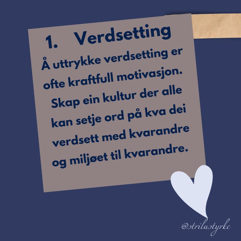 1. Klarar å vere verbal og fysisk i å vise og uttrykke kva dei verdsetter. Både med seg sjølv, med sine kollegaer og miljøet dei er i.