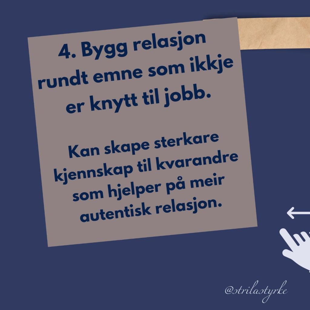 4. Bruker tid på å snakke om ting som ikkje har noko med jobben å gjera. Felles interesse, hobby og meiningar kjem då fram og det igjen styrkar relasjonen. Som igjen styrkar sjansen for at kvar enkelt i teamet er autentisk.